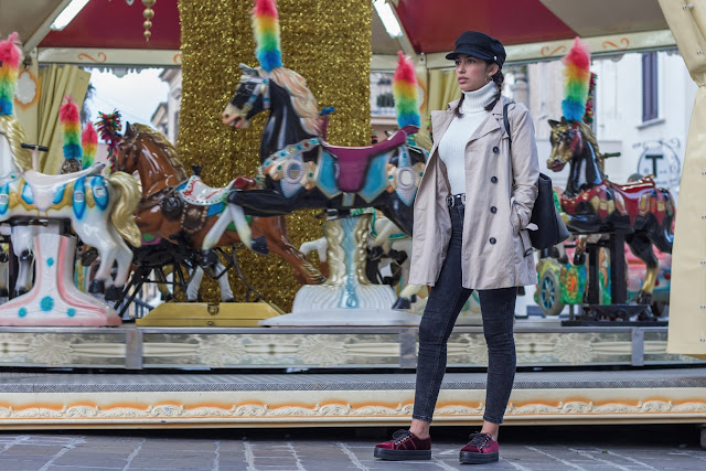 Quindi, un bel maglione bianco, di lana a collo alto mi protegge e compensa la leggerezza del mio trench (so che non è proprio adatto per il freddo, ma su questo outfit mi piaceva troppo).