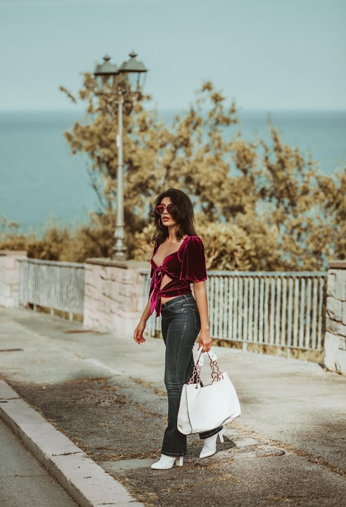 Immancabile, a mio avviso, l’abbinamento con dei jeans a zampa e degli stivaletti bianco zucchero a velo.